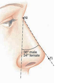 Sad ćemo izmeriti kosinu nosa koja je različita kod žena i muškaraca i idealno iznosi 34 , odnosno 36 stepeni. Dužina nosa, od korena do vrha (na slici je to linija Ni-Ti) treba da iznosi 2/3 dužine od obrva do usana, što se lako izmeri običnim lenjirom, a može se pogledati i sa fotografije.