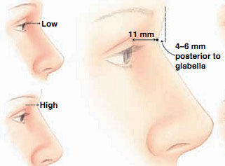 Počećemo od korena nosa. Potrebno je uraditi jednu profilnu fotografiju i videti gde je najniža tačka korena nosa. Njeno mesto treba da je u nivou trepavica gornjeg kapka , a od oka do nosa udaljenost treba da bude 11mm. Tačka na čelu, glabela, treba da bude oko 5 mm ispred korena nosa.